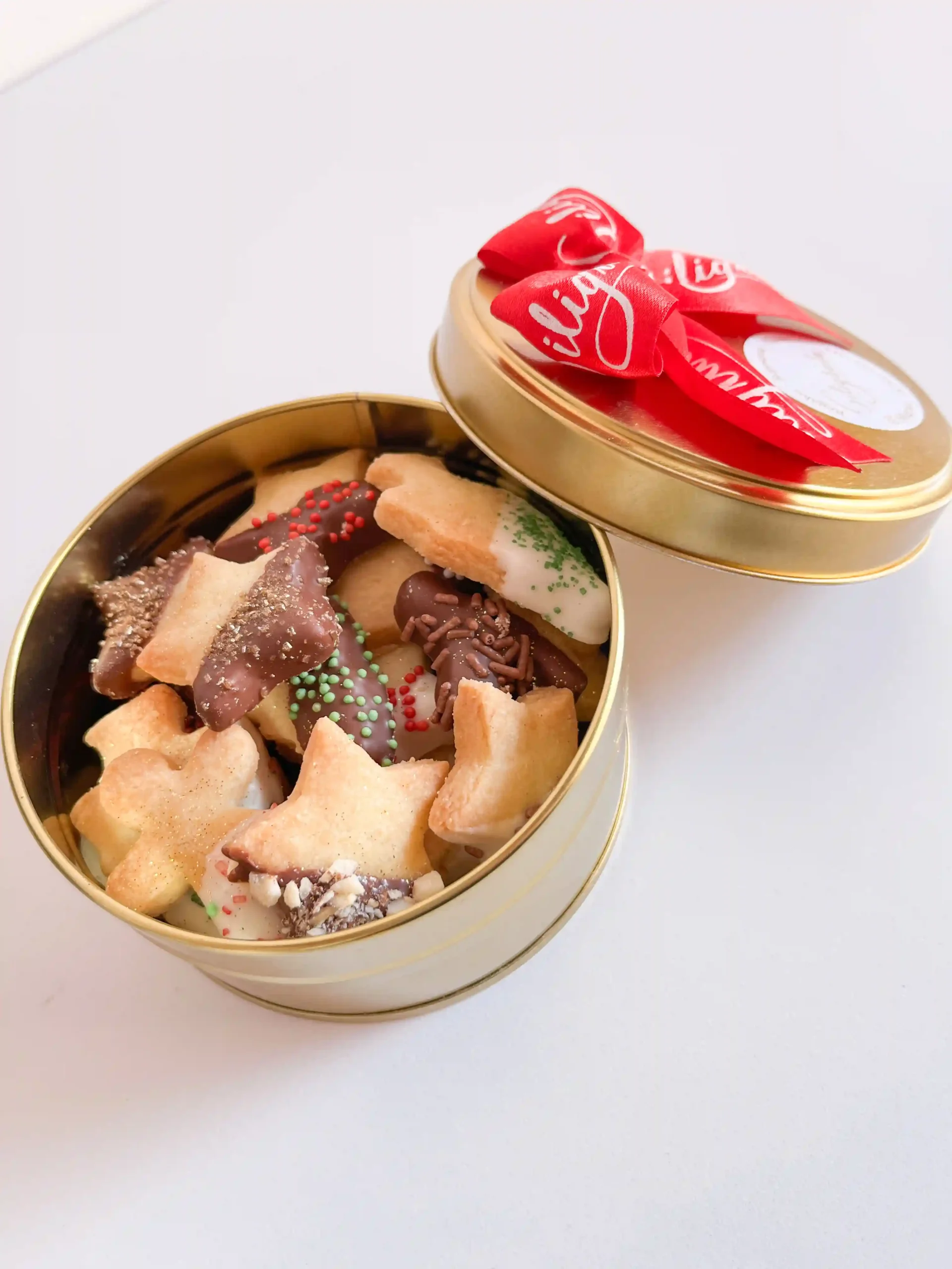 Galletas navideñas de mantequilla crocantes cubiertas con chocolate y toppings como almendras trituradas, azúcar dorada y lluvia de chocolate.